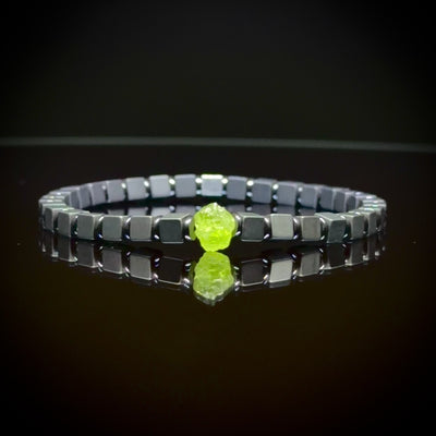 Dieses einzigartige Armband verbindet die kraftvolle, lebendige Energie des Peridots mit den schützenden Eigenschaften des Hämatits. Der matte Logo-Cube in rhodiniertem Finish rundet das Design ab und macht es zu einem Accessoire, das Stärke, Stil und Bedeutung perfekt kombiniert.